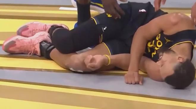 第四節(jié)比賽的時(shí)候,庫(kù)里突然被阿門·湯普森撞倒,傷到了自己的右腿,被迫提前退出比賽,直接回到了更衣室。