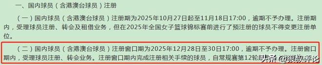 國內(nèi)球員(含港澳臺球員)注冊窗口期為2025年12月28日至30日17:00,逾期不予辦理。注冊窗口期內(nèi),受理球員注冊、轉(zhuǎn)會業(yè)務(wù)。注冊窗口期內(nèi)完成注冊相關(guān)手續(xù)的球員,自常規(guī)賽第12輪起具備上場資格。