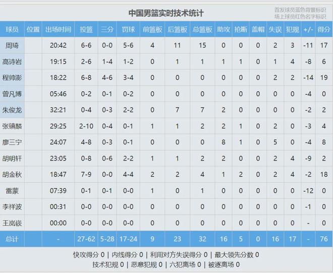 盡管中國男籃把比分迫近到20分以內,無奈前邊挖的坑太大了。全場戰罷,中國男籃76-90不敵韓國,遭遇世預賽兩連敗。程帥澎19分、胡金秋18分4板1助2斷、周琦17分15板。張鎮麟10中2,胡明軒8中0。最后看看數據: