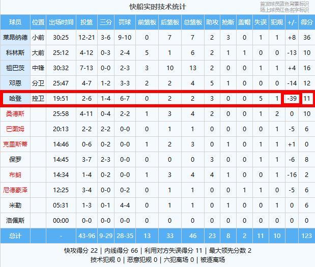 頭號罪人(哈登):全場6中2得11分2籃板3助攻進賬,卻出現了5次失誤,正負值-39斷檔倒數第一,進攻端狀態全員處理球過于隨意失誤太多,第二節后半段上來球隊被打了一波10-29,下半場僅僅打了一分鐘就被棄用,作為運動員在場上連最基本的拼搏態度都沒有,刷新了職業下限!