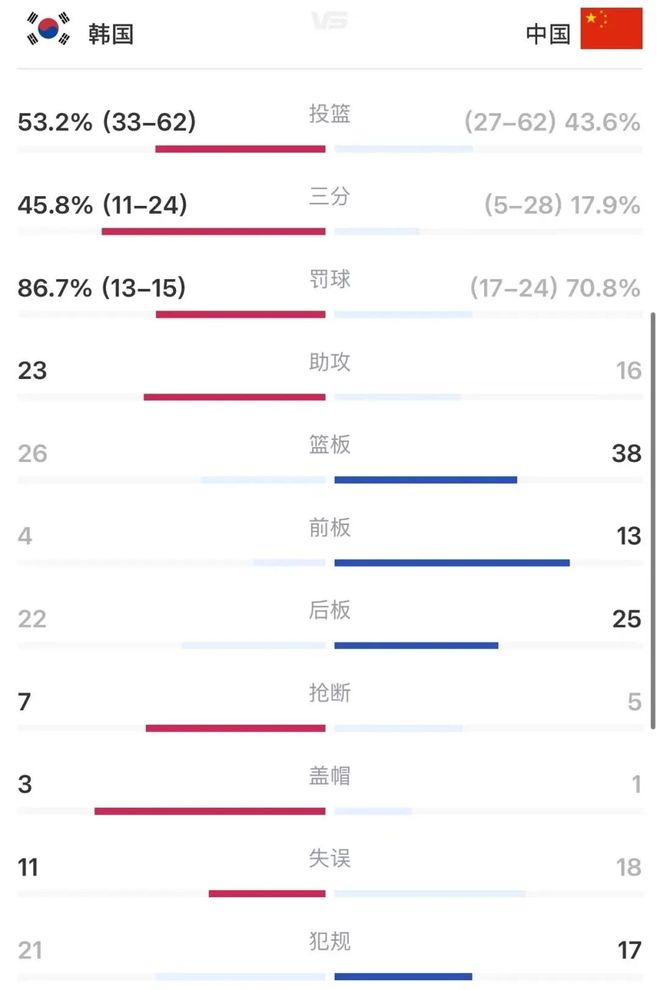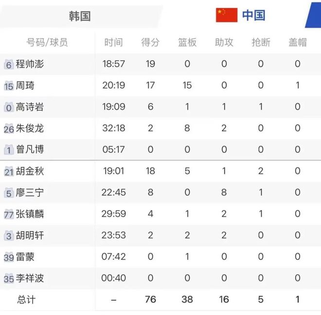 程帥澎挺身而出,內外線連續得分帶動追分勢頭,胡金秋、周琦也在內線不斷取分,但韓國隊也得分不斷,第三節結束分差仍達28分。末節程帥澎意外崴腳傷退,成為比賽又一轉折點,盡管中國隊隨后打出11比0的反擊高潮,卻因前期挖坑過大、外線手感冰涼未能延續勢頭,最終無力回天。