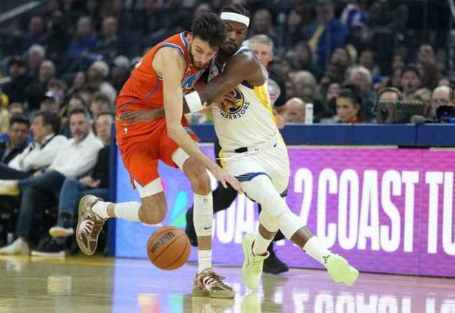 易邊再戰,巴特勒開局未登場,官方也未通報原因(節后通報因左膝酸痛不再回歸)。格林擊地妙傳理查德,后者起飛想要雙手暴扣遭杰威正面大帽扇飛,隨后格林低位單防亞歷山大被吹犯規,朝著裁判大聲抱怨,無奈身背4犯被換下。賽思-庫里突破吸引包夾,助攻斯潘塞上籃打進,勇士一波進攻高潮追到9分分差,打停雷霆。暫停回來,雷霆進攻依舊沒有起色,庫明加搶到前板強起完成雙手暴扣,勇士將分差縮小至4分。亞歷山大強投三分命中后,再造犯規,一人連拿5分穩住局勢,波杰姆斯基運球壓哨三分強投再中,三節打完,勇士91-88落后雷霆3分。