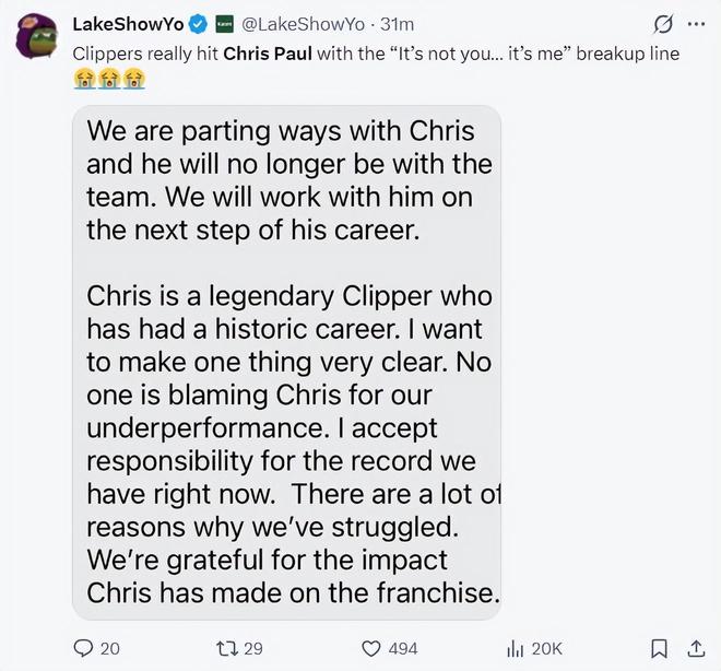 湖人媒體Laker ShowYo直接發了三個哭臉寫道:他們說不是保羅的錯,但卻裁掉了保羅。
