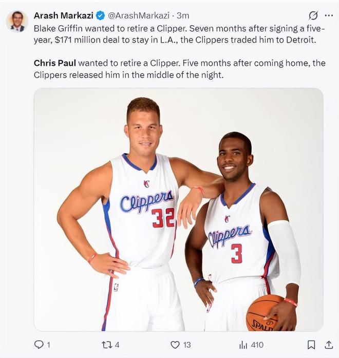 快船記者Joey Linn寫道:NBA是商業聯賽,有些決策不需要帶有個人情噶,快船隊史甚至還沒有退役過球衣,格里芬、保羅都是快船隊史最出色的球員,他們都明確表態愿意在快船退役,可快船管理層都對他們進行了清理,交易格里芬,裁掉保羅,我無法認同快船的行為,他們對兩位球隊代言人的道別非常糟糕。