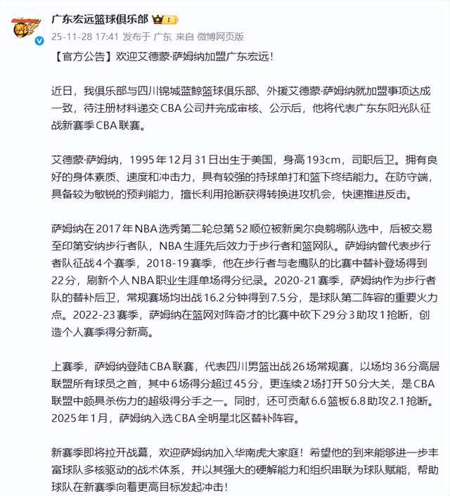 如此勇猛之人,在四川男籃就有些埋沒人才了,恰好四川男籃陷入欠薪風暴,廣東男籃發起沖擊,最終如愿拿到了薩姆納的優先續約權,并且在11月28日下午完成了官宣,薩姆納加盟廣東男籃了。