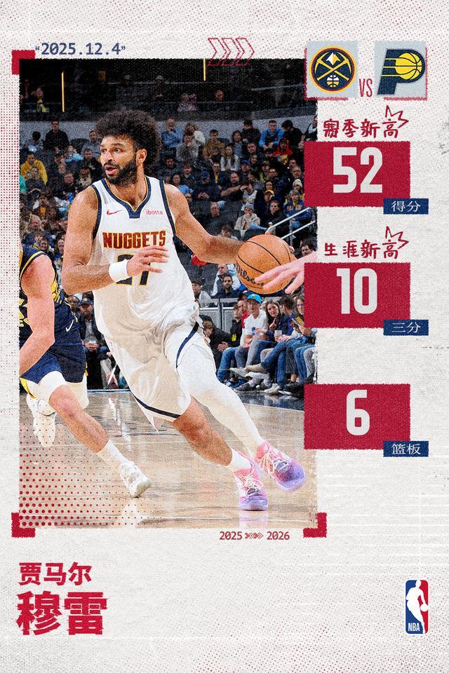 36分鐘的登場時間里,賈馬爾-穆雷25投19中,三分線外11投10中,狂轟52分,槍管冒火。