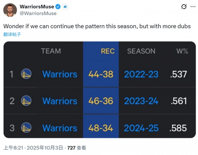 2025-10-03 15:35:03所以這賽季50勝?勇媒:此前三季勇士44勝→46勝→48勝