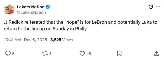 好消息是詹姆斯的問題并不嚴重,東契奇也即將回歸,根據主帥雷迪克賽后透露,詹姆斯與東契奇大概率將在下一場湖人對陣76人隊的比賽中回歸。
