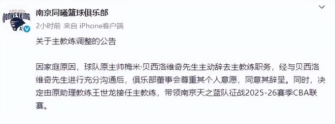雖然新賽季還沒有正式開打,不過已經有球隊進行換帥了,這支球隊就是同曦男籃。據同曦男籃發布官宣,貝西洛維奇因為家庭原因辭去球隊主教練的職務,助教王世龍成為球隊的新主帥。據直播吧透露,貝西洛維奇離隊的原因是因為同曦男籃在俱樂部杯比賽中的表現不好,球隊管理層和他溝通,希望他能夠改變球隊的現狀。不過貝帥表示目前球隊已經失控,部分球員根本就不聽他的戰術安排,貝帥要求裁掉不聽話的球員,但被球隊管理層拒絕。隨后雙方再次溝通,貝帥依舊無法解決問題,最終只能下課。