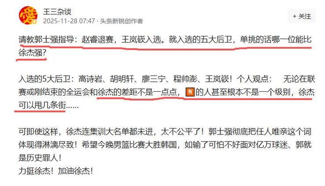 有球迷認為:無論在聯賽或剛結束的全運會,上面的五位后衛和徐杰的差距不是一點點,有的人甚至根本不是一個級別,徐杰可以甩幾條街……。這位球迷請教郭士強指導:趙睿退賽,王嵐嵚入選。就入選的五大后衛,單挑的話哪一位能比徐杰強?