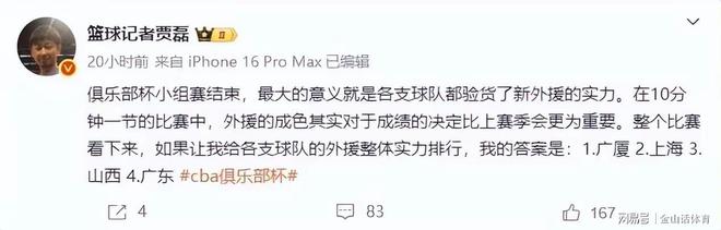經過休賽期的厲兵秣馬,各隊的引援工作,如今基本上進入尾聲。通過俱樂部杯賽的檢驗,各隊所引進的外援“是騾子是馬”,也基本看出了端倪。日前,國內著名體育記者賈磊排出了新賽季的外援實力榜,這位資深媒體人,通過俱樂部杯賽各隊的外援表現,分析得出結論,認為外援實力最強的四支球隊,分別是廣廈男籃、上海男籃、山西男籃和廣東男籃。