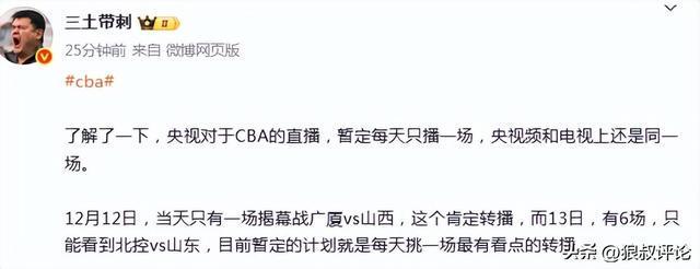 北京時間12月10日,根據媒體人三土帶刺的發文報道,央視對于CBA的直播,暫定每天只播一場,央視頻和電視上還是同一場。