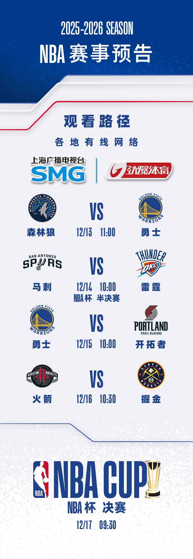 進(jìn)入NBA杯半決賽,東西部總共四支球隊(duì)將前往拉斯維加斯,爭(zhēng)奪最終的NBA杯冠軍!如果您不知道在哪里能夠收看如此精彩的比賽,那小編提醒您關(guān)注勁爆體育頻道!12月14日和12月17日,讓我們一同見(jiàn)證NBA杯冠軍的誕生!與此同時(shí),勁爆體育頻道還將為您帶來(lái)精彩的常規(guī)賽較量,更能和楊瀚森一同闖蕩NBA!