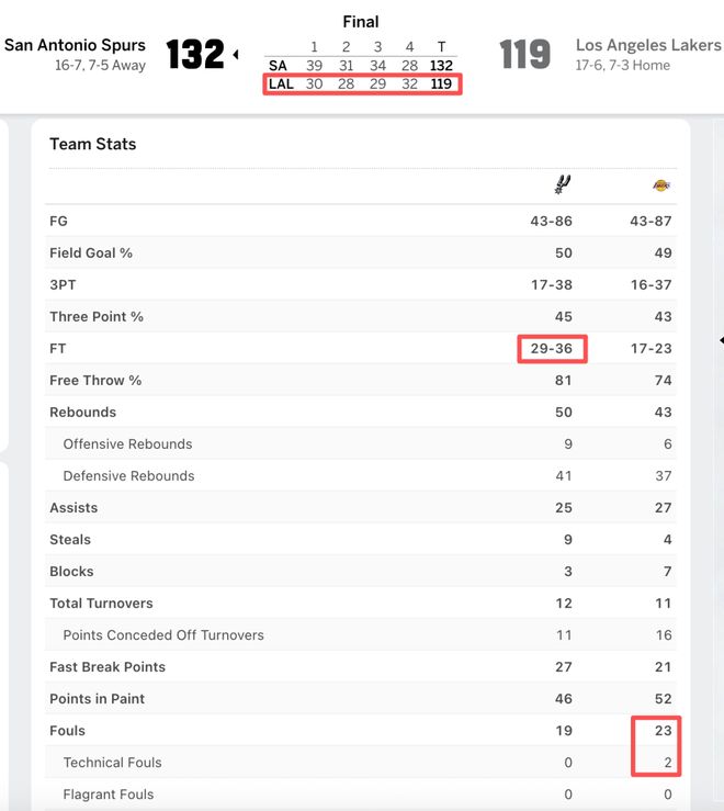 可誰(shuí)知道,湖人自那之后就再也沒(méi)有領(lǐng)先過(guò),第二節(jié)開始3分鐘的得分荒讓湖人身處被動(dòng),加上馬刺加強(qiáng)進(jìn)攻的侵略性不斷沖擊籃筐造成犯規(guī)走上罰球線和湖人隊(duì)無(wú)謂的犯規(guī)越來(lái)越多,湖人就此交出了主動(dòng)權(quán)。這樣的情況此后成為了全場(chǎng)比賽的主旋律,從技術(shù)統(tǒng)計(jì)來(lái)看,湖人全場(chǎng)比賽多達(dá)23次犯規(guī),讓馬刺在罰球線上拿了28分,這近乎是湖人隊(duì)一節(jié)的得分。