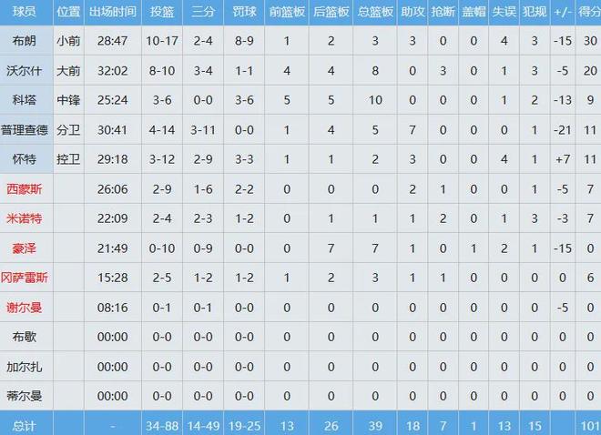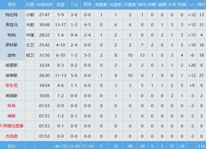 庫茲馬難得爆發(fā),竟然投籃17中13,以高達(dá)約76%命中率轟下31分外加6板;小波特繼續(xù)強力輸出,獨攬18分10板13助,三雙到手。
