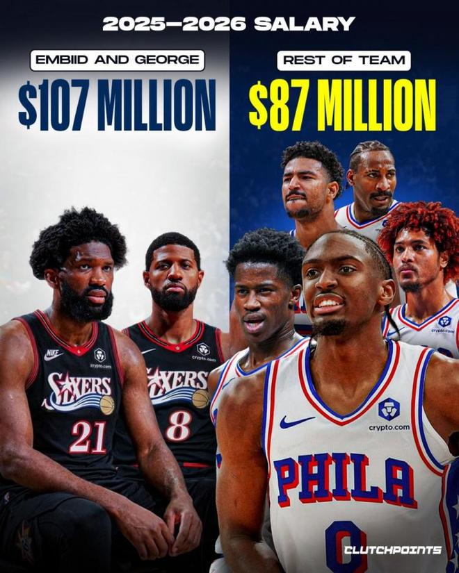 但兩人的合同卻是一個比一個大,恩比德年薪5520萬美元,喬治年薪5170萬美元,兩人合計1.07億美元,占據全隊總薪水的55%。