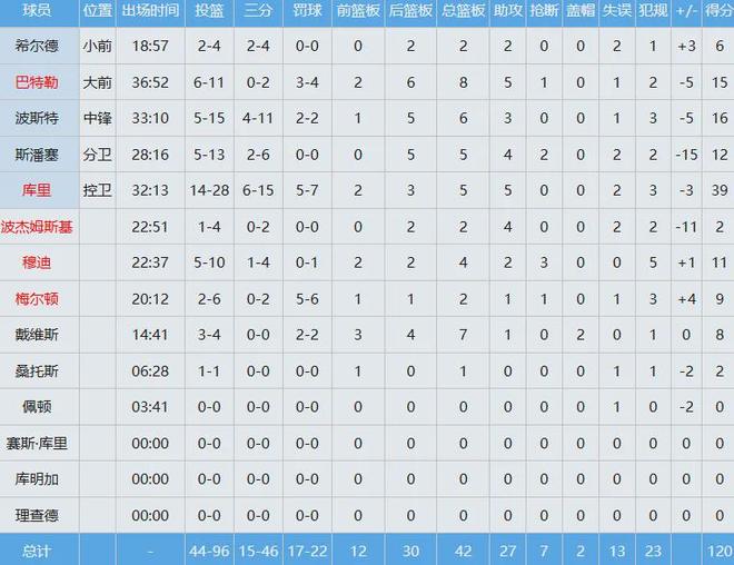 時隔五場比賽,庫里重新披掛上陣,投籃28中14,其中三分15中6獨攬39分5板5助,可惜難救主,勇士120-127不敵森林狼,戰績來到13勝13負排名西部第八。