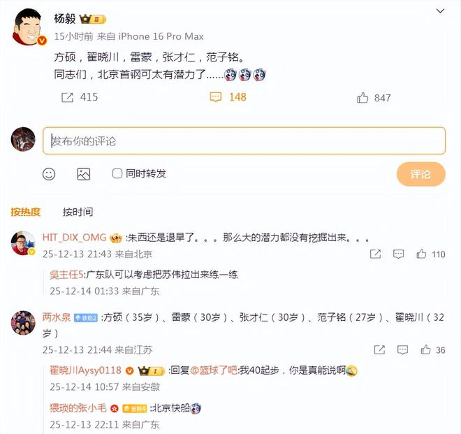 知名籃球評論員楊毅直接譏諷道:“方碩,翟曉川,雷蒙,張才仁,范子銘。同志們,北京首鋼可太有潛力了……”