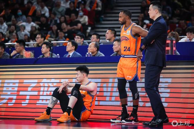 上海男籃首發(fā)陣容為王哲林、李添榮、李弘權(quán)及雙外援洛夫頓、古德溫。