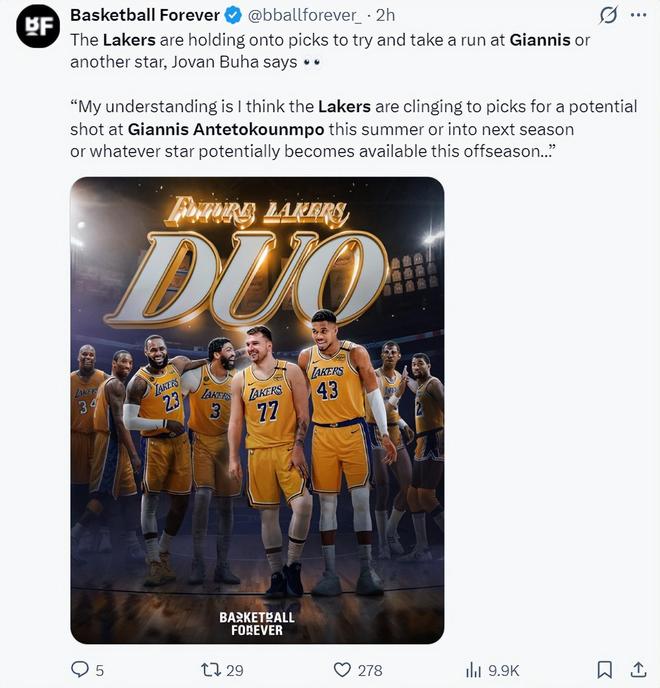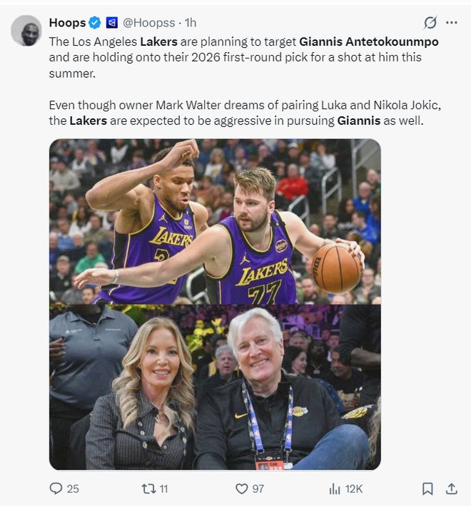 隨后美媒Hoops寫道:雖然湖人老板馬克-沃爾特最希望的是看到東契奇與約基奇聯手,但預計湖人隊也會嘗試得到揚尼斯。