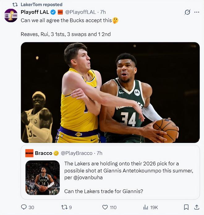 如此一來湖人就可以得到揚尼斯,組建揚尼斯+東契奇的巔峰超巨組合,當然這是湖媒最理想的狀態,因為像揚尼斯這個級別的超巨肯定會有很多球隊報價,說不定其他球隊的報價更吸引雄鹿呢?