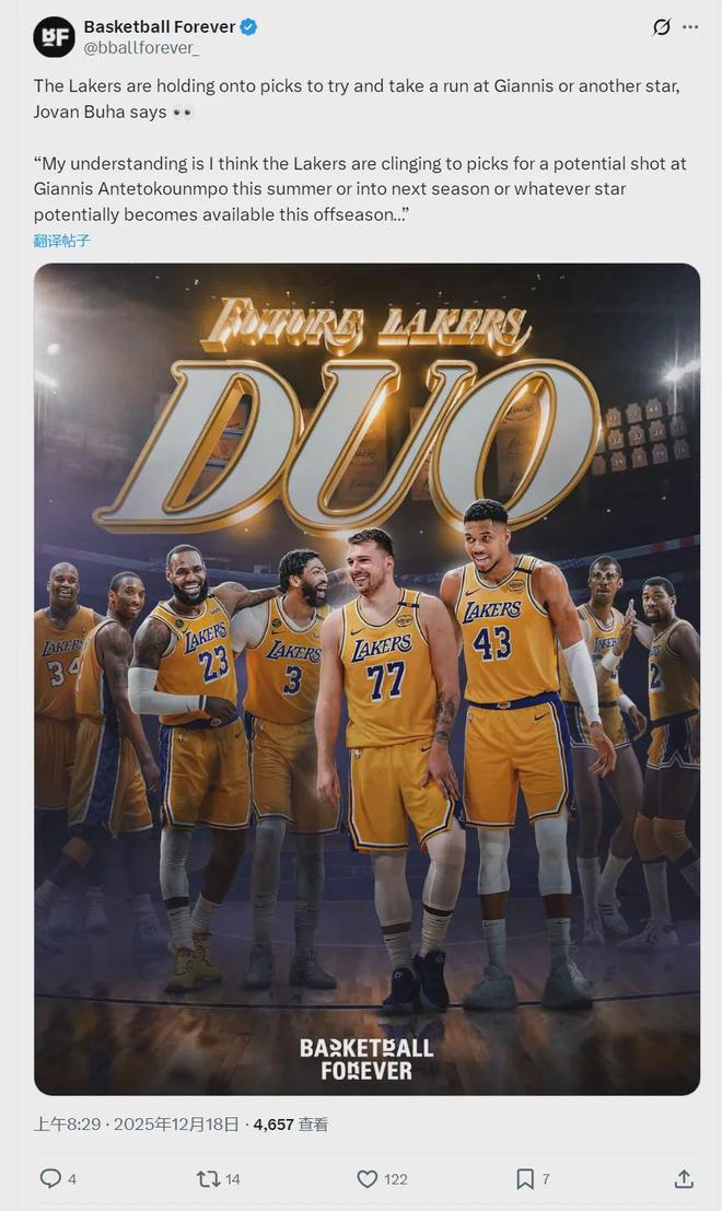 北京時間12月18日,據湖人記者Jovan Buha 報道,湖人將字母哥作為重點追逐目標:“湖人之所以緊握2026年首輪選秀權,是為了在明年夏天追逐字母哥。屆時湖人有3個能交易的首輪簽,再加上先簽后換的里夫斯,以及其他球員配平薪資。”
