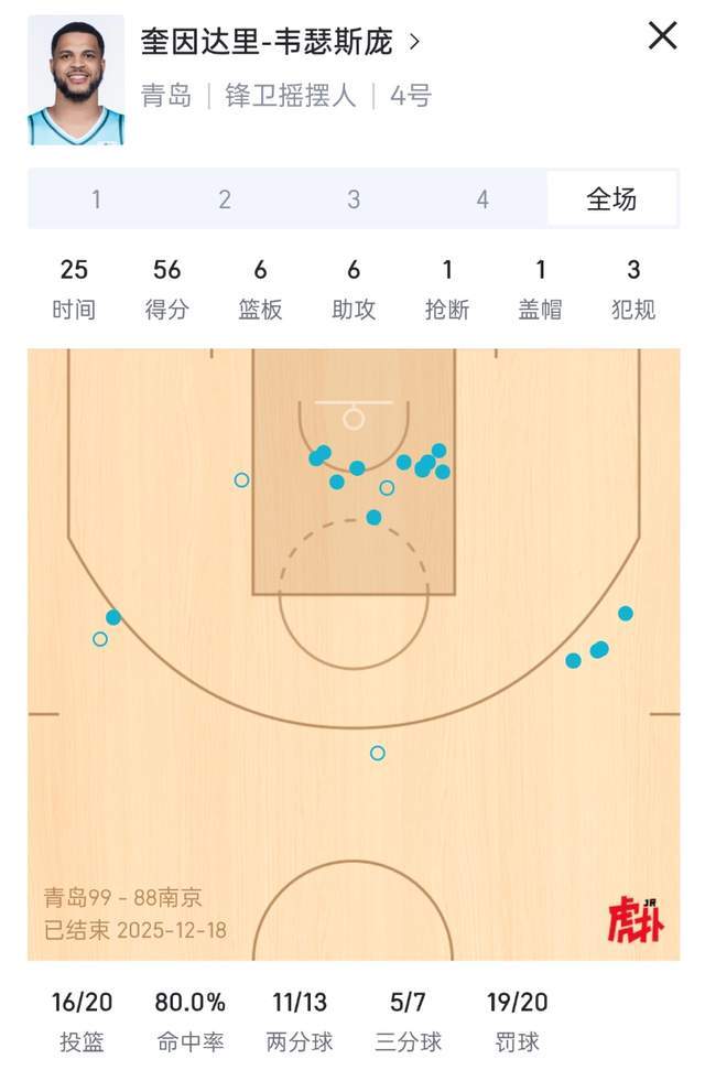 從數據來看,威瑟斯龐20投12中,命中率高達80%,其中三分球7投5中,罰球20罰19中,手感真是太好了。只能說,這表現太夸張了吧。