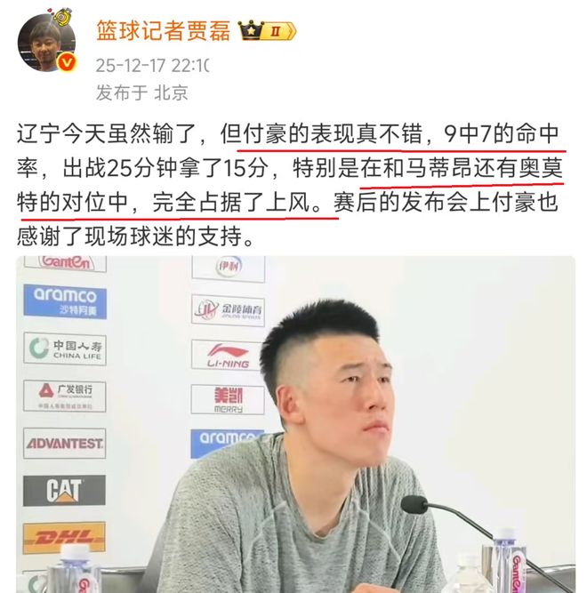 遼寧隊輸給北京首鋼隊13分!在賽后,北京記者賈磊,卻點贊遼寧隊主力鋒線球員付豪,他認(rèn)為付豪表現(xiàn)太出色,完全不輸給北京隊兩大外援。賈磊是這樣說道:與外援對位,完全占據(jù)上風(fēng),表現(xiàn)真不錯!