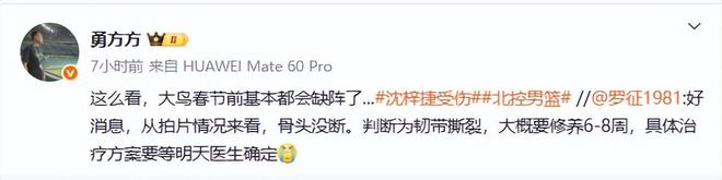沈梓捷的傷情也是令北控球迷非常擔心,韌帶有沒有斷裂?這都是球迷牽掛的事,而且深夜沈梓捷的傷情報告出來了。據北京媒體勇方方報道,”從拍片情況來看,骨頭沒斷。判斷為韌帶撕裂,大概要休養6-8周,具體治療方案要等明天醫生確定。”這么看,大鳥春節前基本都會缺陣了。不過骨頭沒斷,是不幸中的萬幸。看來休息兩個月后,又可以重回賽場了。