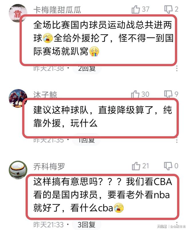 “全場比賽國內球員運動戰總共進兩,全給外援掄了,怪不得一到國際賽場就趴窩。”;“建議這種球隊,直接降級算了,純靠外援,玩什么?”;“這樣搞有意思嗎???我們看CBA看的是國內球員,要看老外看nba就好了,看什么cba”;“青島打得太難看了,就兩外援二人轉,雖然贏了,沒有同曦打得有意思。”……