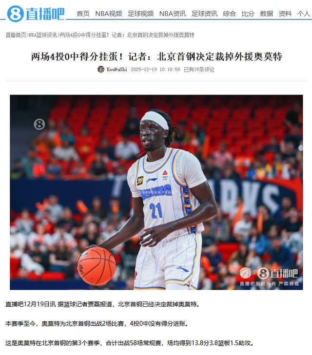 直播吧:兩場4投0中得分掛蛋!記者:北京首鋼決定裁掉外援奧莫特
