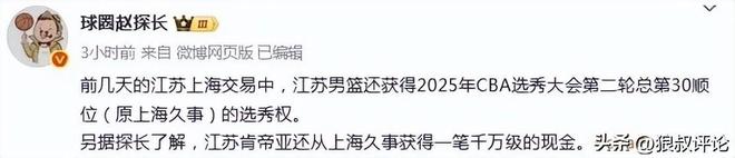 此前,根據(jù)媒體人趙探長報道,江蘇男籃送走崔曉龍的交易當中,獲得了一筆千萬級別的轉(zhuǎn)會費。