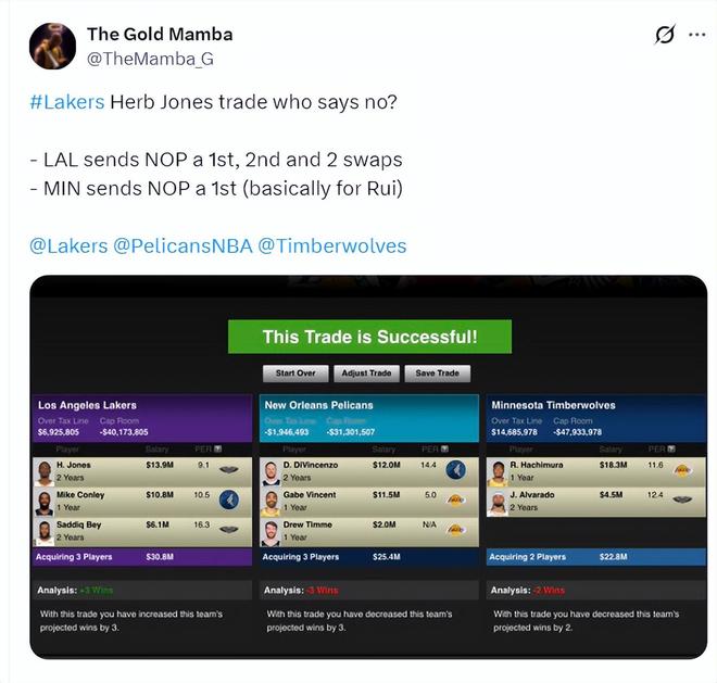 湖人球迷則建議拉入灰熊作為第三方,湖人只需要出一個首輪簽足以: