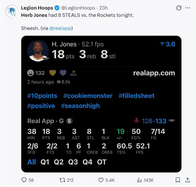 一天之前,瓊斯在逆轉(zhuǎn)火箭的比賽中38分鐘,14中7,拿到18分3籃板3助攻8搶斷1蓋帽,命中率50%,他追平鵜鶘隊史單場最高搶斷,這位身高2.03米的側(cè)翼真的太能防了,本賽季場均1.8搶斷聯(lián)盟第五。