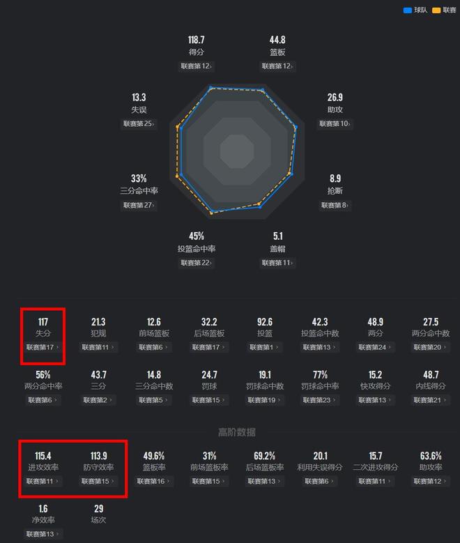 上賽季還是全明星水準外線核心之一的加蘭本賽季退步成了一名普通球員,13場球場均16.9分3籃板6.5助攻,投籃命中率只有37%,三分命中率32%,在場上攻不進防不住,米切爾身上的壓力太大了!不僅如此內線核心小莫布里從DPOY球員,退化成一名純進攻型球員,本賽季的騎士防守效率113.9僅僅排名聯盟第15,要知道他們上賽季可是防守效率第5的強隊!在剛剛結束的一場比賽中,米切爾休戰騎士主場面對東部第十的公牛,這本該是他們贏球的好機會,然而他們又搞砸了!第四節最后時刻被公牛一波8-3高潮確定勝局,加蘭關鍵失誤直接葬送比賽,這場比賽過后騎士排名跌到了東部第八,與第九的老鷹沒有勝場差,只領先東部第十一的雄鹿2.5個勝場!