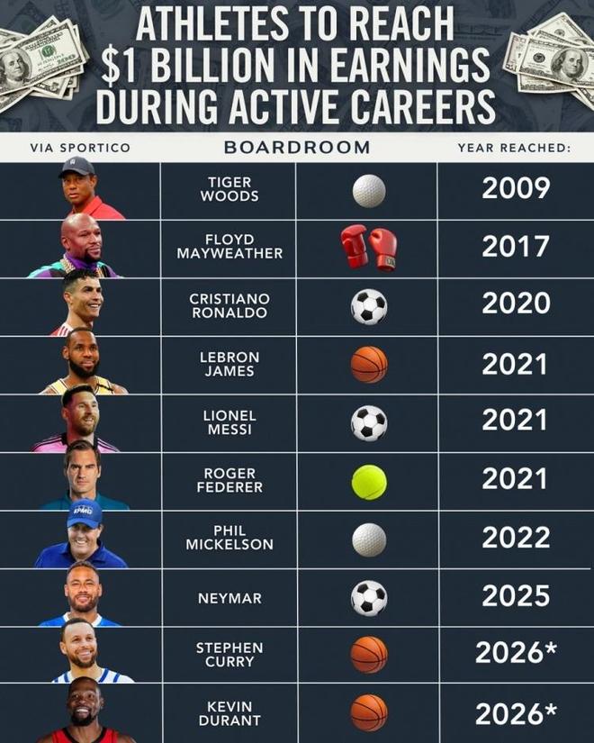 庫里和杜蘭特將與詹姆斯一起,成為現役NBA球員中僅有的三位總收入超過10億美元的球員。