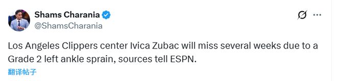 北京時間12月22日,據名記Shams報道,ESPN消息源透露,洛杉磯快船隊中鋒祖巴茨因左腳踝二級扭傷,將缺陣數周時間。另外,TA的報道稱至少要休戰三周。