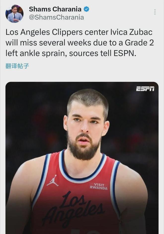 祖巴茨是在近日結束的快船103-88湖人同城德比中受傷,首節末拋投后落地時不幸踩到詹姆斯從而扭傷了自己的腳踝。