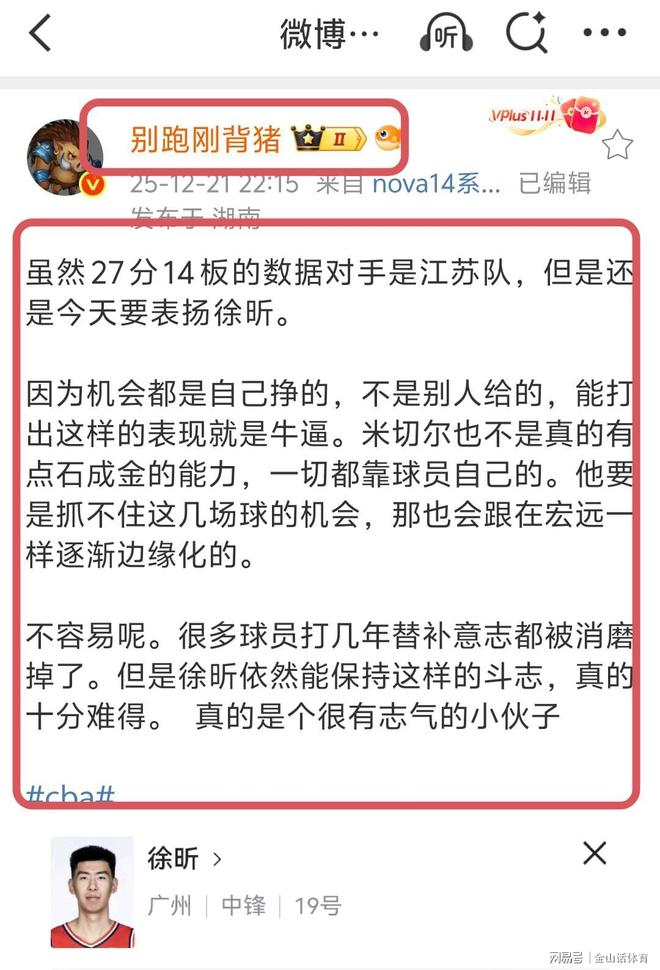 賽后,媒體人別跑剛背豬社媒發文:“雖然27分14板的數據對手是江蘇隊,但是還是今天要表揚徐昕。因為機會都是自己掙的,不是別人給的,能打出這樣的表現就是牛逼。米切爾也不是真的有點石成金的能力,一切都靠球員自己的。他要是抓不住這幾場球的機會,那也會跟在宏遠一樣逐漸邊緣化的。不容易呢。很多球員打幾年替補意志都被消磨掉了。但是徐昕依然能保持這樣的斗志,真的十分難得。 真的是個很有志氣的小伙子。”。