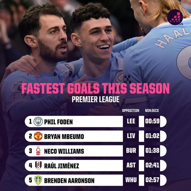 英超第13輪,曼城主場(chǎng)對(duì)陣?yán)澛?lián),開場(chǎng)第1分鐘福登破門為曼城取得領(lǐng)先,據(jù)統(tǒng)計(jì),這是本賽季英超最快進(jìn)球,也是首粒在開場(chǎng)第1分鐘打入的進(jìn)球。
