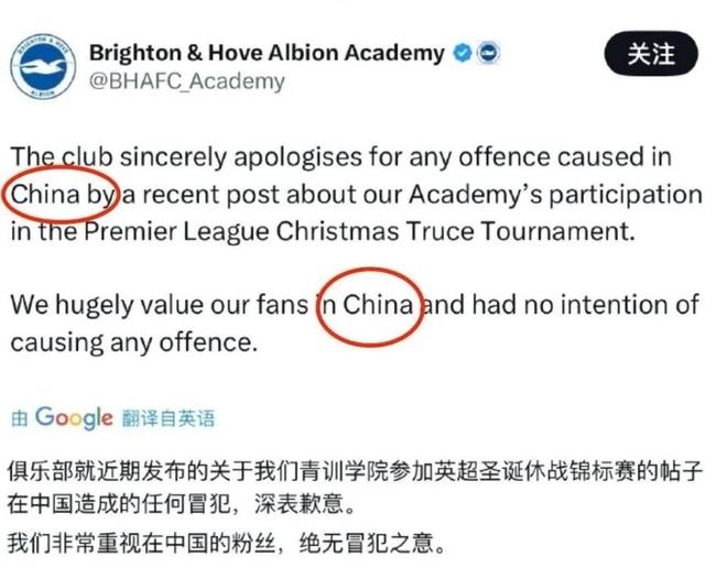 布萊頓將這張照片發到官方社媒,結果遭到中國球迷的猛烈批評,隨后,俱樂部刪除照片并道歉:“針對近期發布的帖子在中國造成的任何冒犯,俱樂部深表歉意。我們非常重視中國的球迷,我們絕無冒犯之意。”