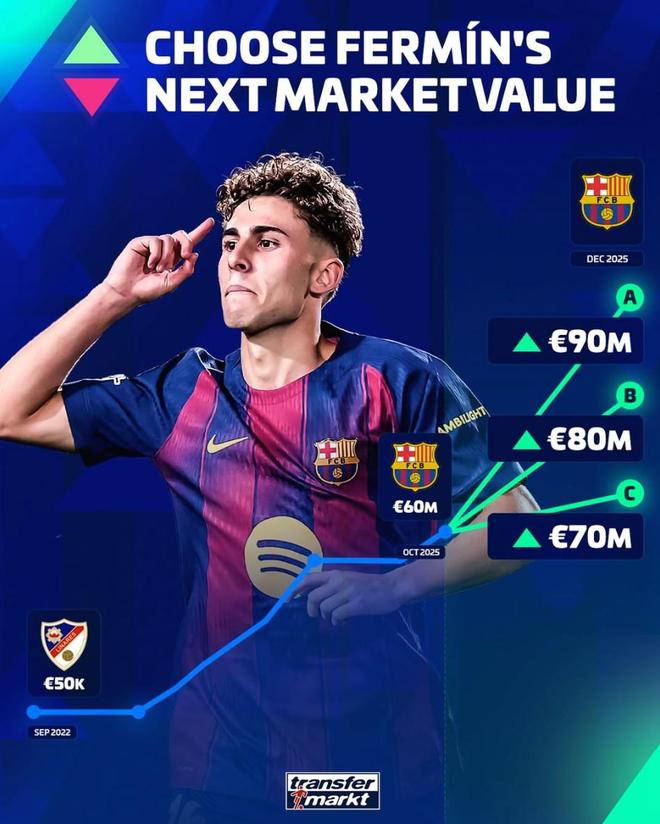 北京時間11月30日,德轉預熱了巴塞羅那中場球星費爾明-洛佩斯的身價更新,他們給出的三個選項全都為上漲,最高升至9000萬歐元。德轉將在12月12日更新西甲球員的身價,現年22歲的費爾明-洛佩斯目前的身價為6000萬歐元,本賽季至今他代表巴薩出場13次,其中10次首發,貢獻7粒進球和4次助攻。在預熱費爾明-洛佩斯最新身價的同時,德轉分別給出了三個選項,最高為上漲至9000萬歐元,其次為上漲至8000萬歐元以及上漲至7000萬歐元。