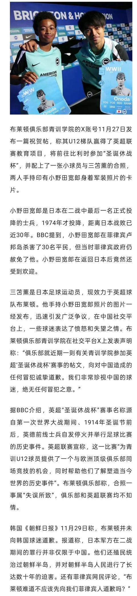 大象新聞2025-12-01 10:19:37據英國廣播公司(BBC)11月29日報道,英超布萊頓俱樂部當天就其社交媒體上一張引發爭議的圖片道歉,圖中,日本國腳三笘薰與一名小球員各自手持一張印有二戰時日本軍官小野田寬郎頭像的卡片。來源 | 環球時報主編 | 彭丹編輯 | 蔣黎明