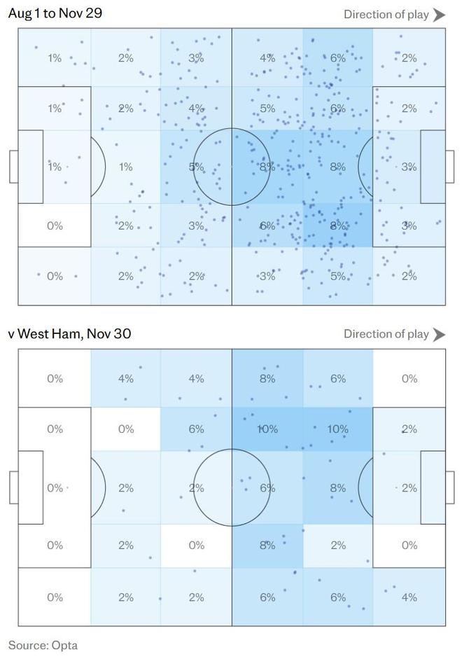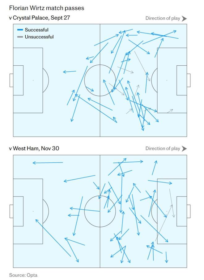 關(guān)鍵在于,本場僅有的兩次傳球失誤,都是嘗試傳入禁區(qū)的“最后一傳”,且都險些創(chuàng)造進球。相比之下,十月份對陣布倫特福德時,維爾茨丟球11次,其中5次發(fā)生在自家半場。明顯的對比是,本場比賽當維爾茨與隊友配合時,球隊展現(xiàn)出了更強勁、更流暢的向前推進勢頭。