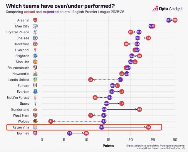 維拉是本賽季英超最“離譜”的球隊,預期13.5分實際拿到24分,反面則是狼隊,同樣預期13.5分,實際只有2分。
