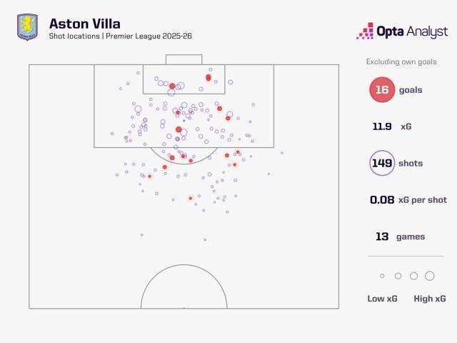 維拉本賽季射門位置分布,紅點為進球,7個是禁區內,9個是禁區外。