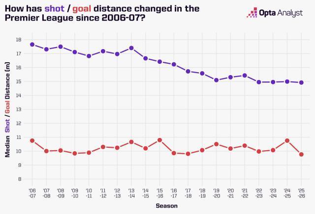 近十幾年,英超的平均射門(紫)和進球(紅)距離總體走低。