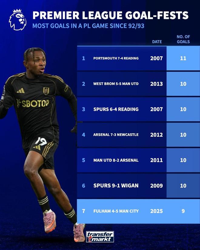 英超第14輪,曼城客場5-4險勝富勒姆,據統計,這是英超歷史上第七高的比分,只有6場比賽的進球數比這場比賽更多。英超歷史進球最多的比賽排行11球 樸茨茅斯7-4雷丁 200710球 西布朗5-5曼聯 201310球 熱刺6-4雷丁 200710球 阿森納7-3紐卡斯爾 201210球 曼聯8-2阿森納 201110球 熱刺9-1維岡競技 20099球 富勒姆4-5曼城 2025【上咪咕獨家看英超】