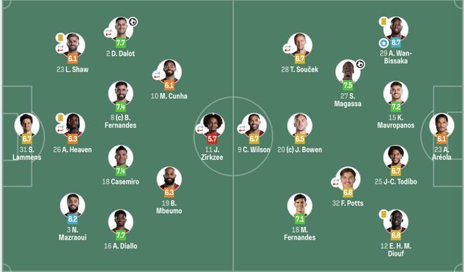 曼聯(3421):31-拉門斯;3-馬茲拉維,26-海文(46’15-約羅),23-盧克肖(88’6-利馬);16-迪亞洛,18-卡塞米羅,8-B費,20-達洛特(68’13-多古);19-姆伯莫,10-庫尼亞(77’25-烏加特;11-齊爾克澤(78’7-芒特)