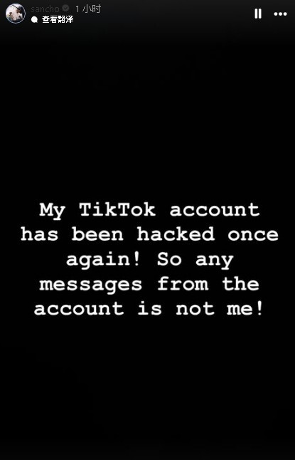 2025-10-04 00:02:17被黑了!桑喬:我的TikTok賬號再次被盜!任何發出的消息都非本人